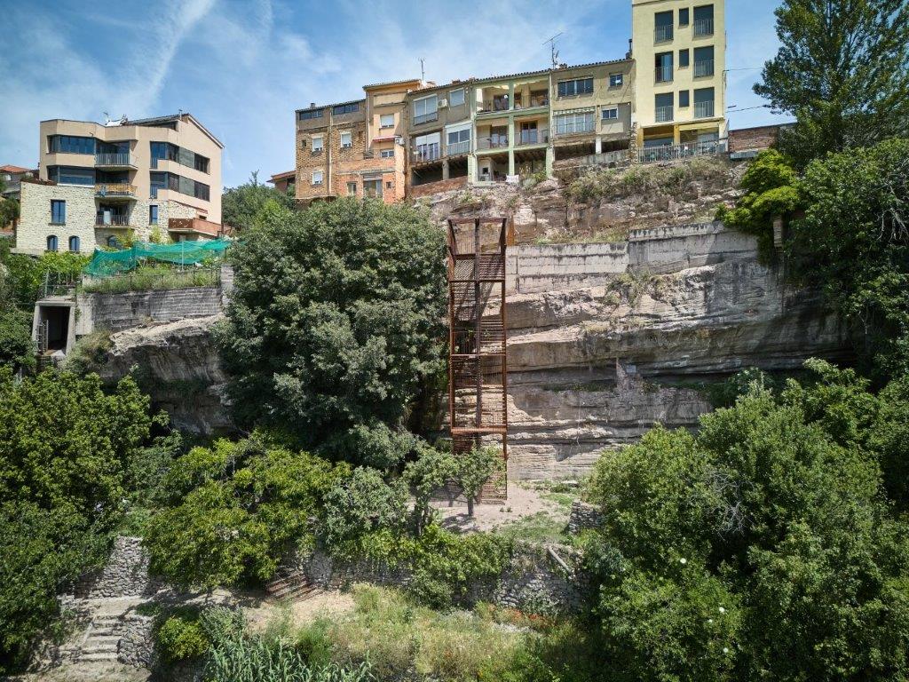 L’escala com a mirador: entre el pes de la terra i la lleugeresa de l’aire. La intervenció recupera un tram perdut del Camí Ignasià a Manresa, unint el Pont Vell i la Creu del Tort fins al Pou de llum.