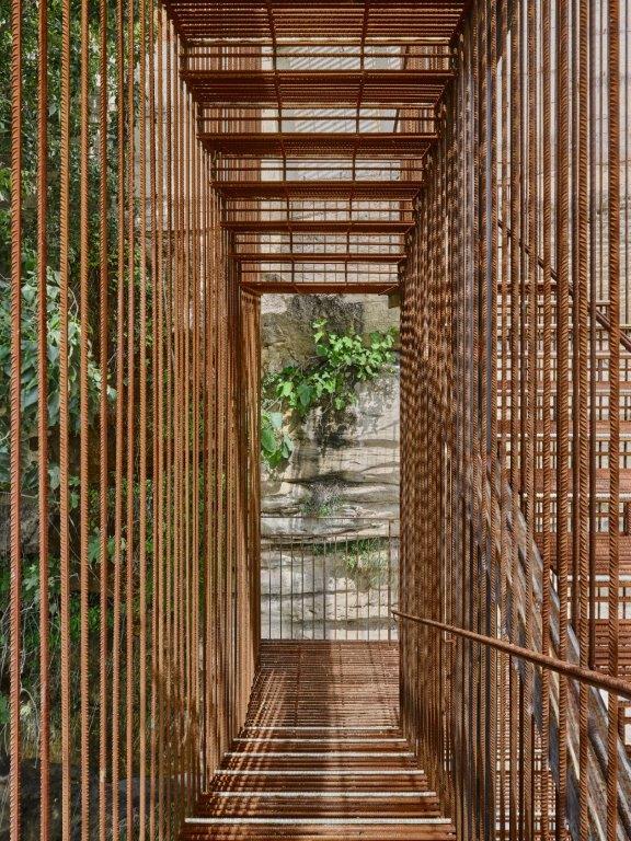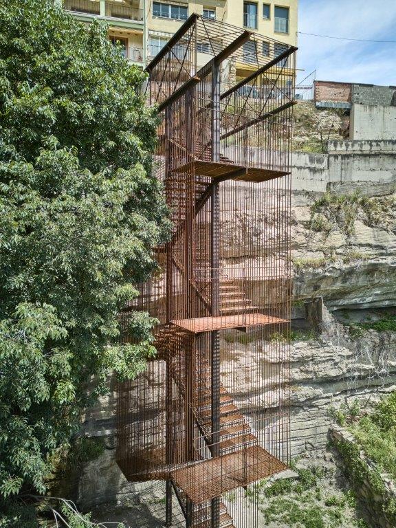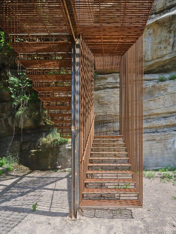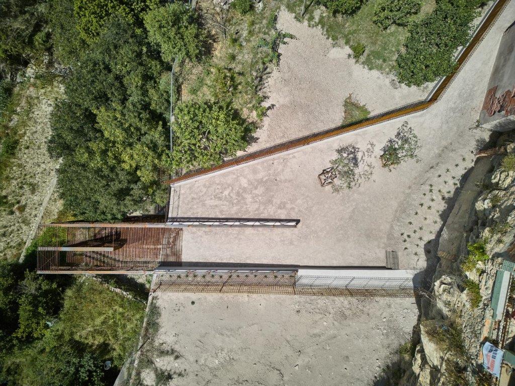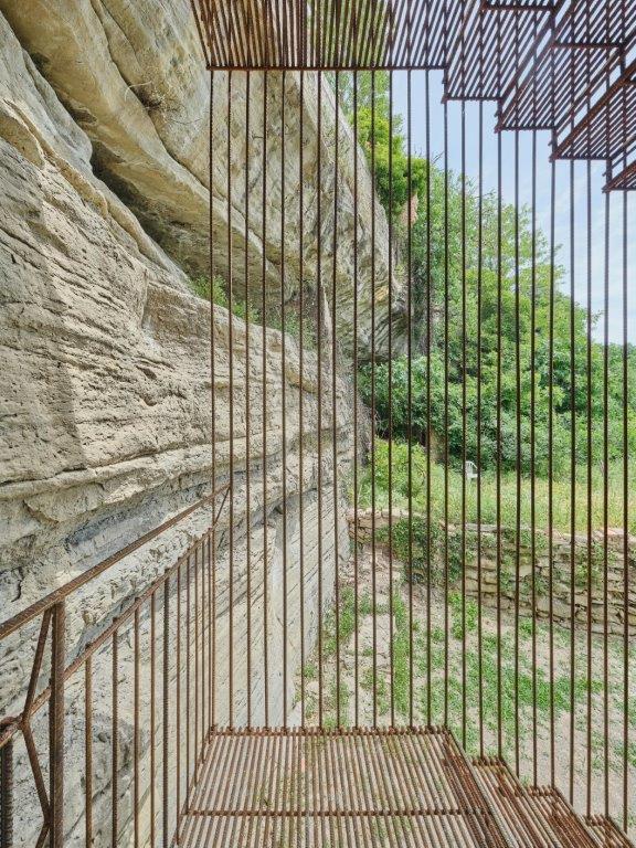 L’escala salva els 13 metres de desnivell entre la balma inferior i la terrassa superior, obrint una nova mirada de la ciutat cap a la Vall del Paradís, el Cardener i el massís de Montserrat. Separada de la roca, es presenta com un element permeable, que permet veure-hi a través. Una cortina de rodons d’acer filtra el paisatge sense interrompre’l, generant una tensió subtil entre l’interior i l’exterior, entre la protecció i la contemplació.