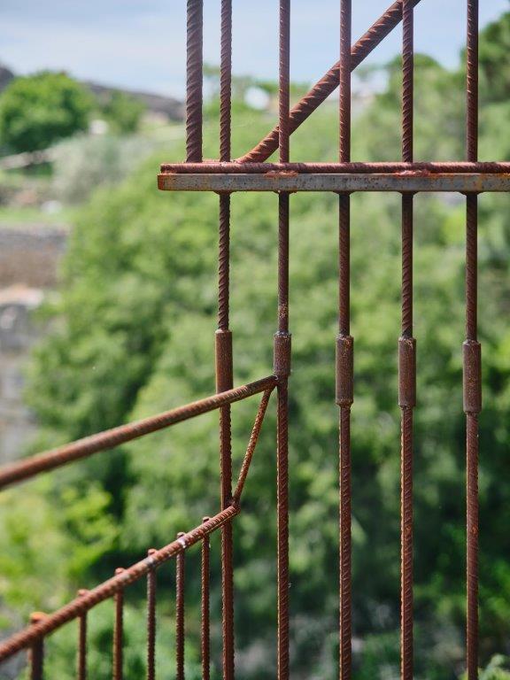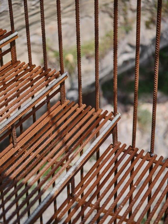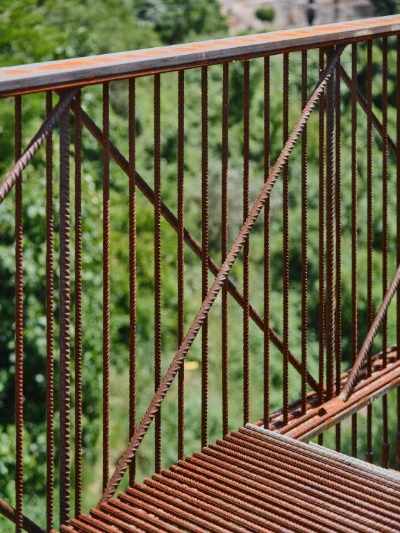 Tot el projecte s’articula a partir d’un llenguatge material unitari: l’acer. La repetició d’un únic element de barra corrugada de Ø16mm construeix tota l’escala. Aquesta austeritat formal respon a una ètica de la mesura: emprar només el necessari, deixar que la matèria dialogui amb la llum, amb el temps i amb la presència humana.